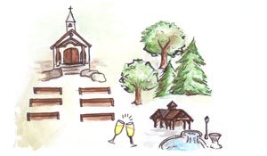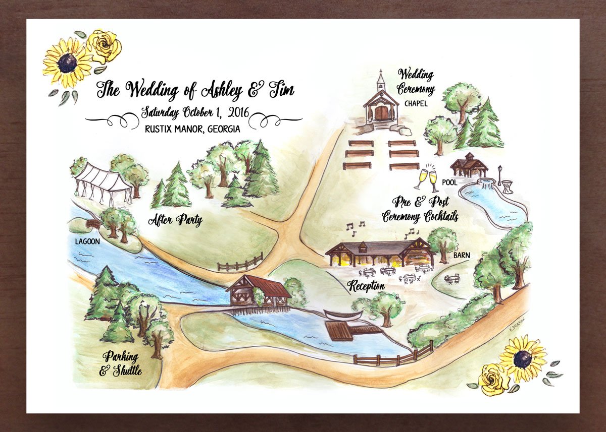 Custom Illustrated Wedding Map Custom illustrated map featuring the various events and locations for a rural farm wedding in Georgia.